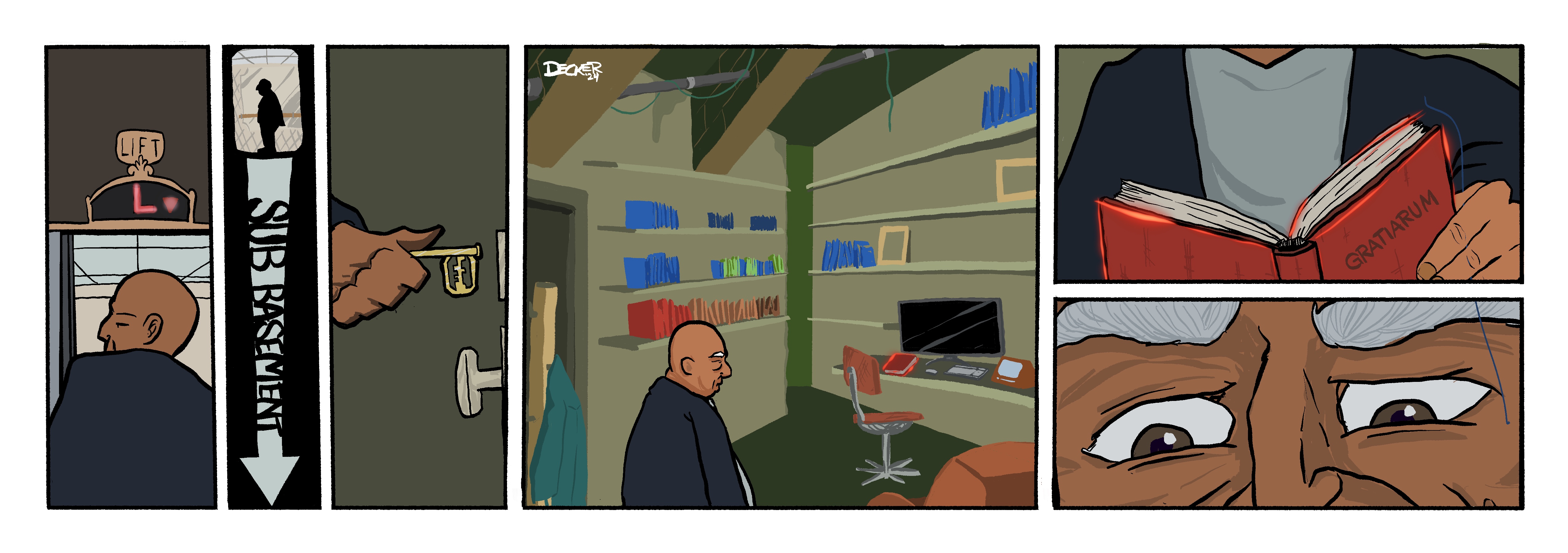 Also, we see the book “Gratiarum” … it means “Graces” in Latin. Why would he be reading up on grace? And what are those red whisps?!